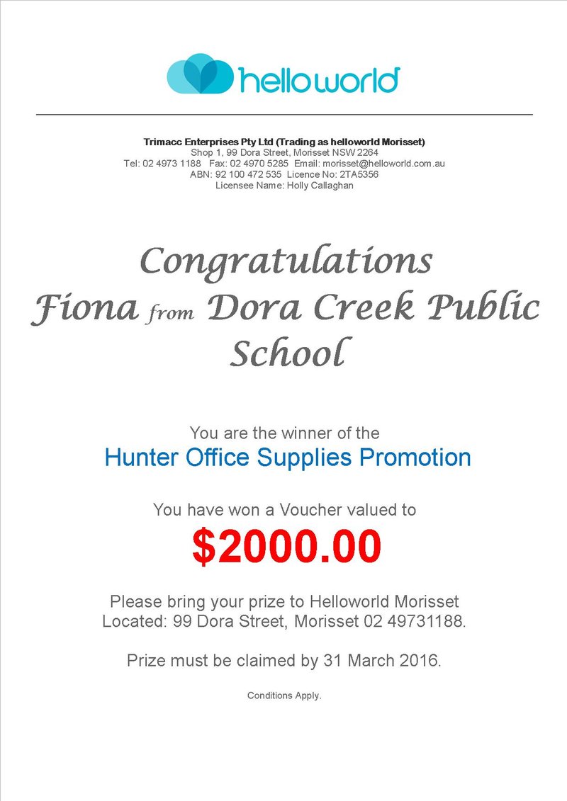$2000 holiday winner 13 April 2026 | Hunter Office Furniture Congratulations to Dora Creek Public School. The winner of our grand prize of a $2000 Helloworld holiday voucher. Drawn by Holly from Helloworld Morisset. Share: