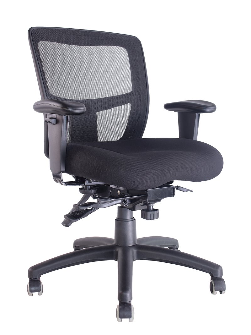 This chair is one of the best value options on the market. It has a moulded thick foam seat with a mesh ratchet back to adjust to different heights, Seat Tilt, Back Tilt Tension adjustment, Seat height adjustment, A seat slide for extra leg room , heavy duty long lasting caster wheels.